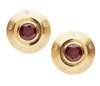 each of circular outline, collet set with a round cut garnet in a lightly textured gold surround set with five small round cut diamonds, stamped 18K to reverse and indistinct maker mark, with post and clip fittings