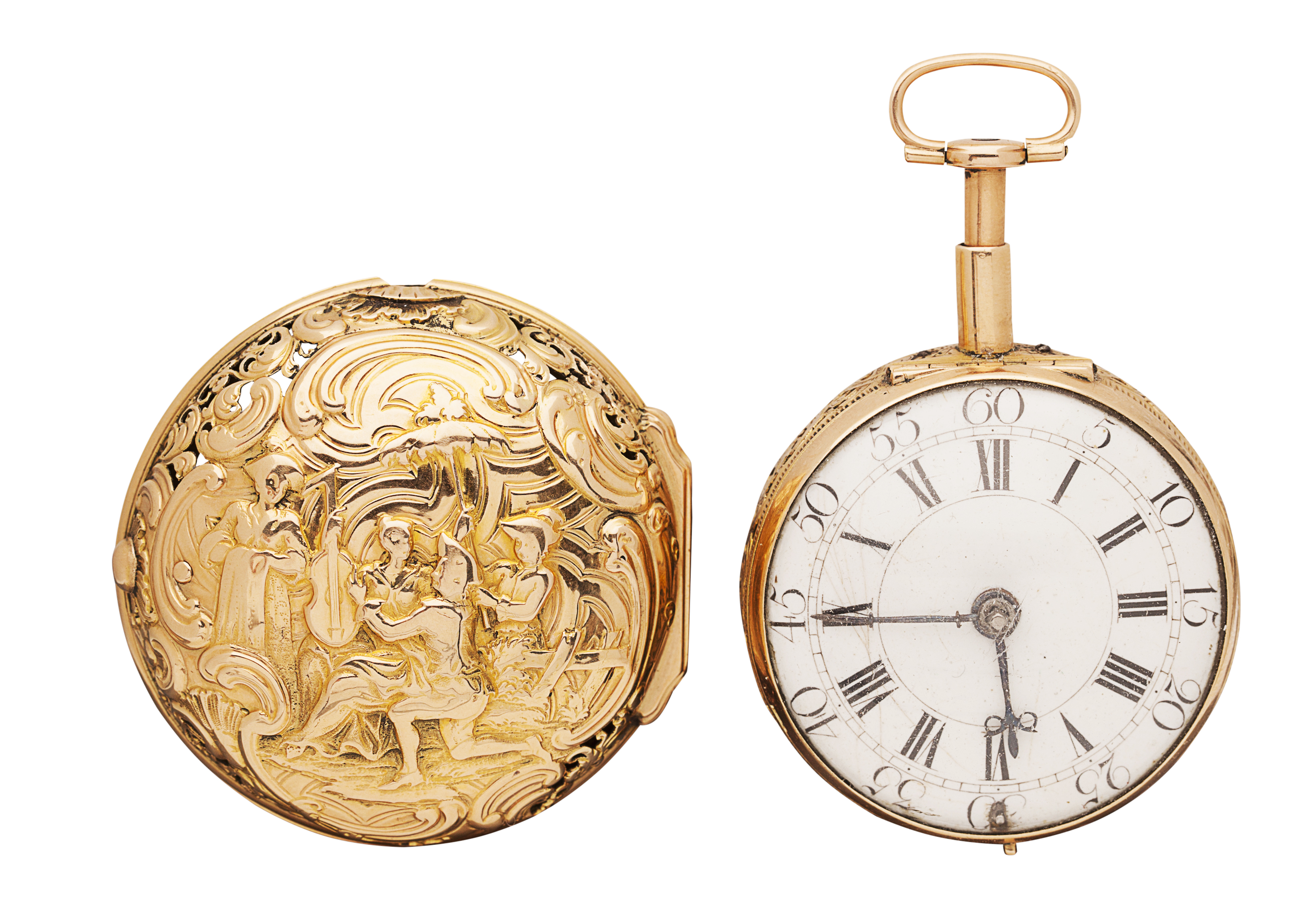 the outer gilt case. pierced and chased figural condition, the inner case with pierced and engraved decoration, the white enamel dial with Roman and Arabic numerals, blued hands, verge movement, inscribed 'Drakaub?? London' square baluster support columns, repeat mechanism