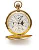 the plain 18ct gold hunting cases enclosing the enamel dial with month, date, day of week, seconds, moon phase, Roman numerals for time, outer vernier scale for seconds with stop watch sweep second hand, full minute repeat striking on two gongs with two hammers