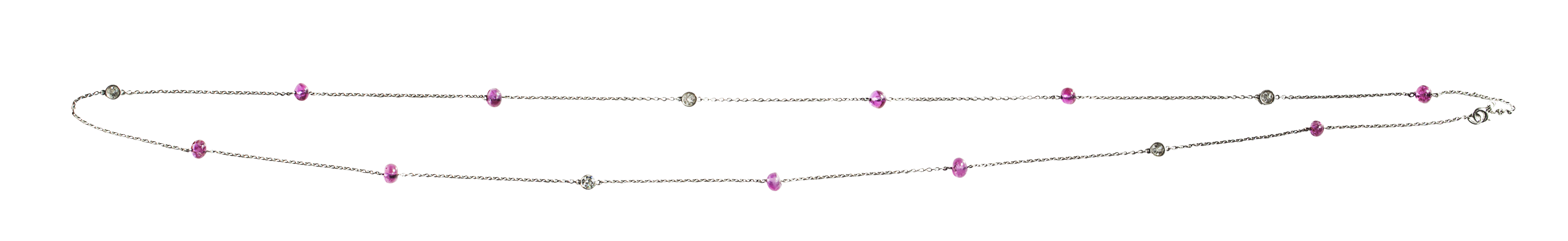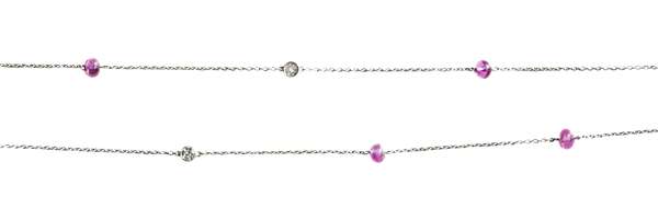 the white metal trace link chain set at intervals with polished ruby beads and collet set round cut diamonds