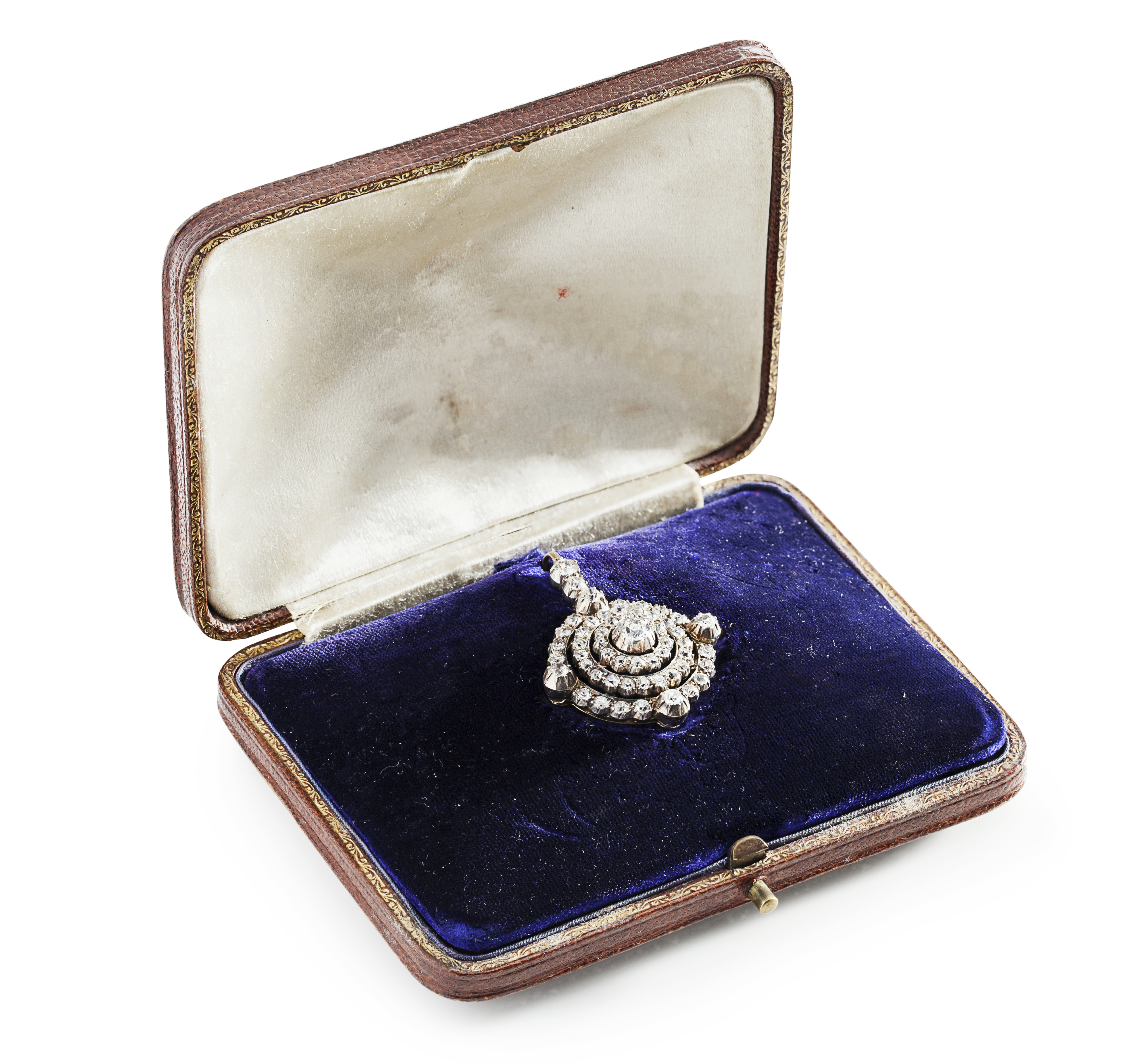of circular outline, composed of stepped rows of small round cut diamonds with a detachable diamond set bale, to a trace link chain with simple diamond set clasp, in a fitted tooled leather box