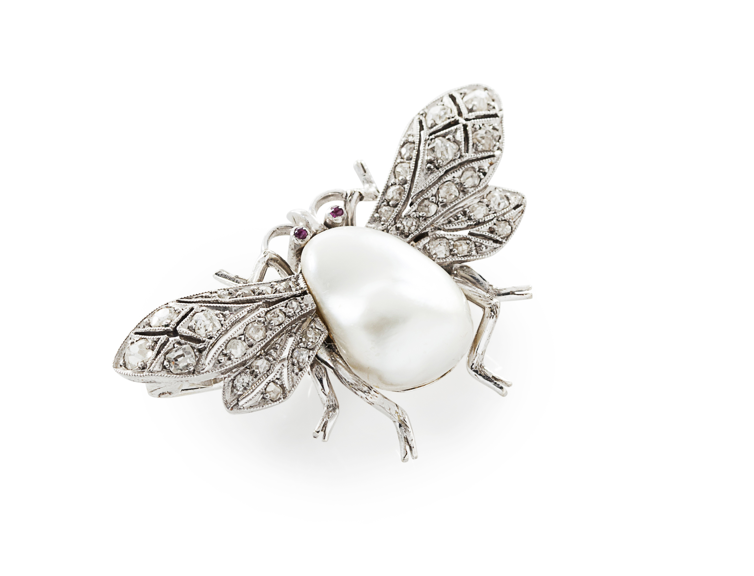 modelled as a bee, set in unmarked yellow metal with a large baroque pearl, the wings set throughout with small old cut diamonds and two small cabochon ruby eyes