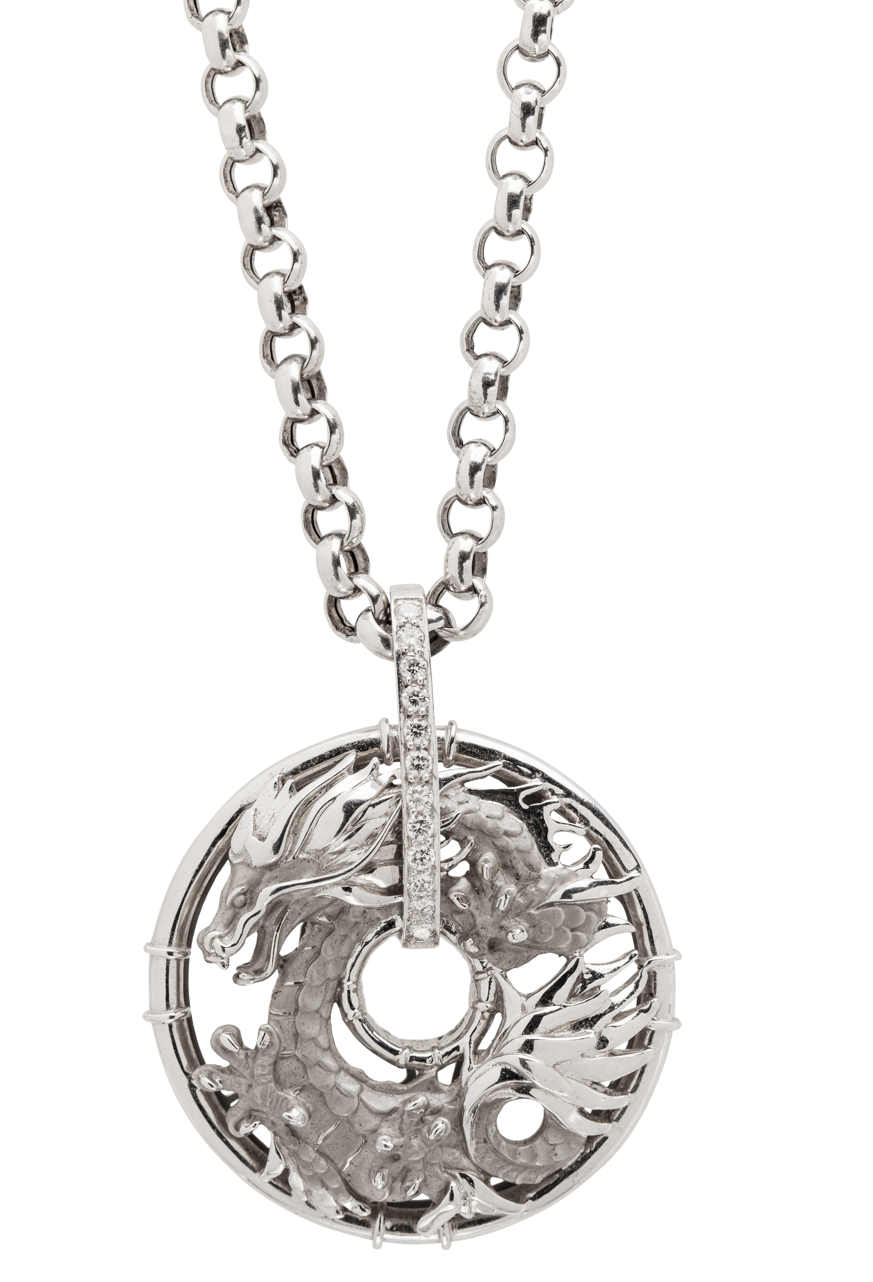 of circular outline, with pierced Chinese dragon detail with an elongated bale set with twelve small round cut diamonds, on a belcher link chain