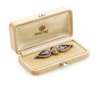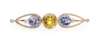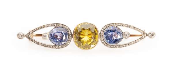 millegrain set with an oval mixed cut yellow sapphire, flanked to either side by a round mixed cut blue sapphire in an open pearl shaped border set with small rose cut diamonds and two millegrain round cut diamond accents, August Frederik Hollming (1854-1915), fifty-six zolotniks mark, in original fitted Fabergé box