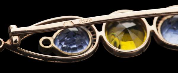 August Frederik Hollming (1854-1915) born in Loppis, Finland. He was a specialist in case work and this piece is unusuial for him, it is more in the style of Holmstrom. The design is interesting in the metal work shape has been designed and incorporates well the shape of the two blue sapphires