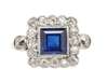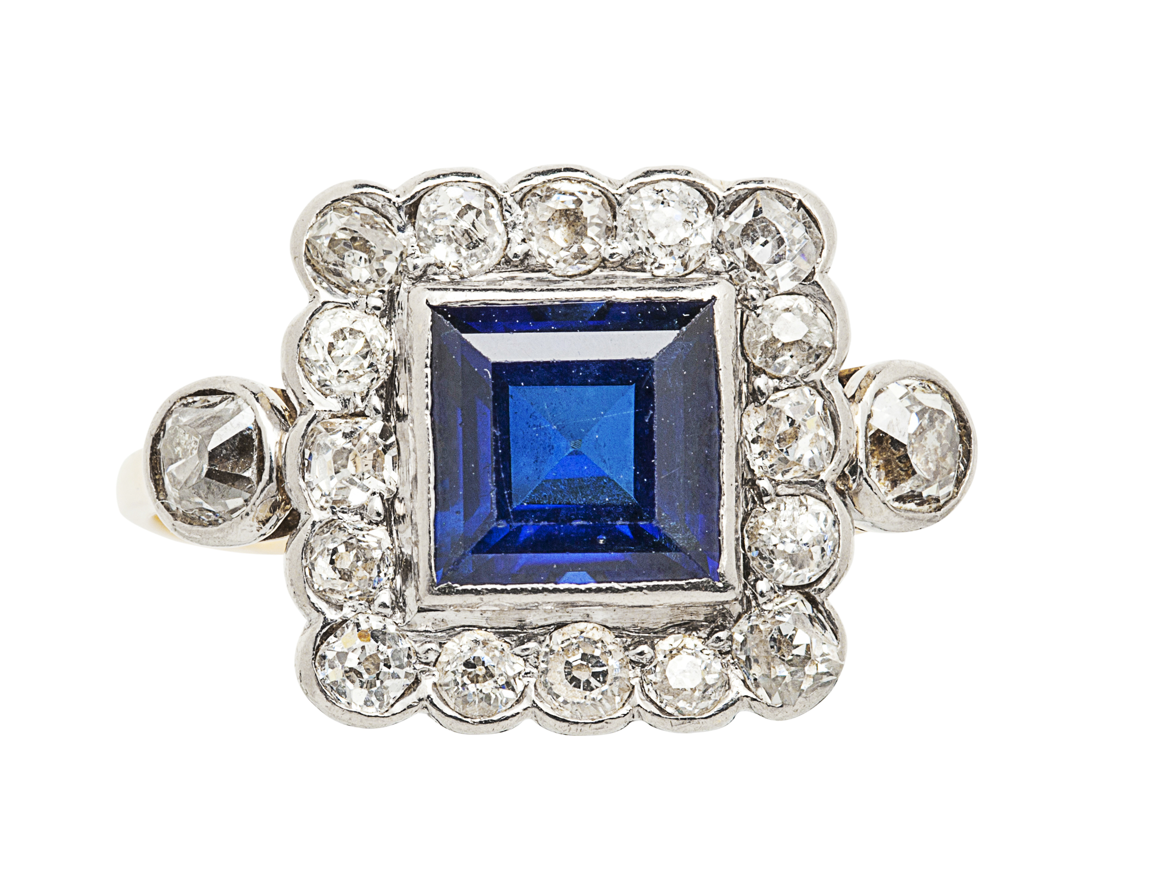 collet set with a square cut sapphire in a single border of old round cut diamonds, each shoulder collet set with a further round cut diamond, to a plain unmarked yellow metal shank