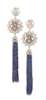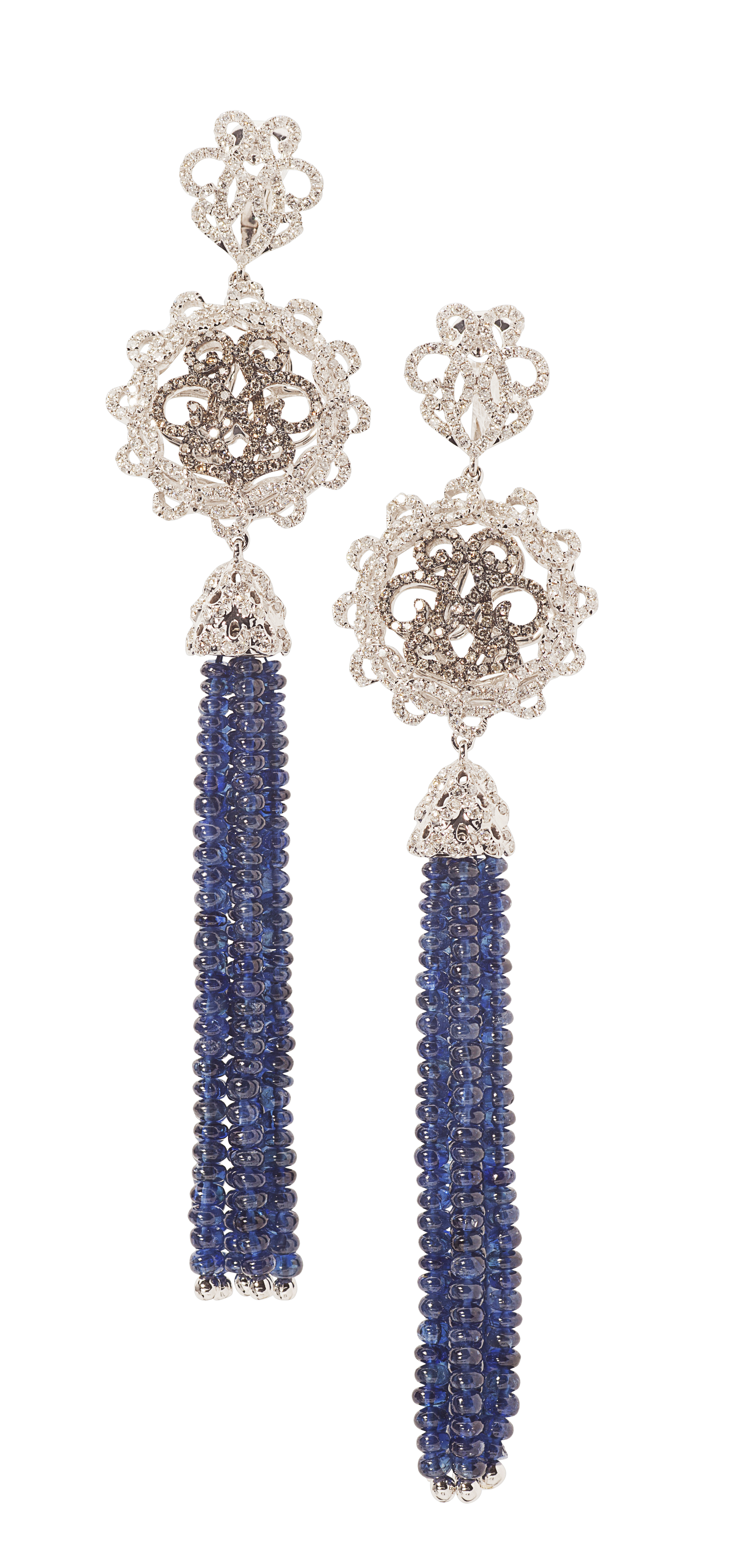 composed of two graduated pierced scrolling links set throughout with small round cut diamonds, the whole suspending six strands of sapphire beads from a white metal diamond set mount, with post and clip fastenings stamped 750