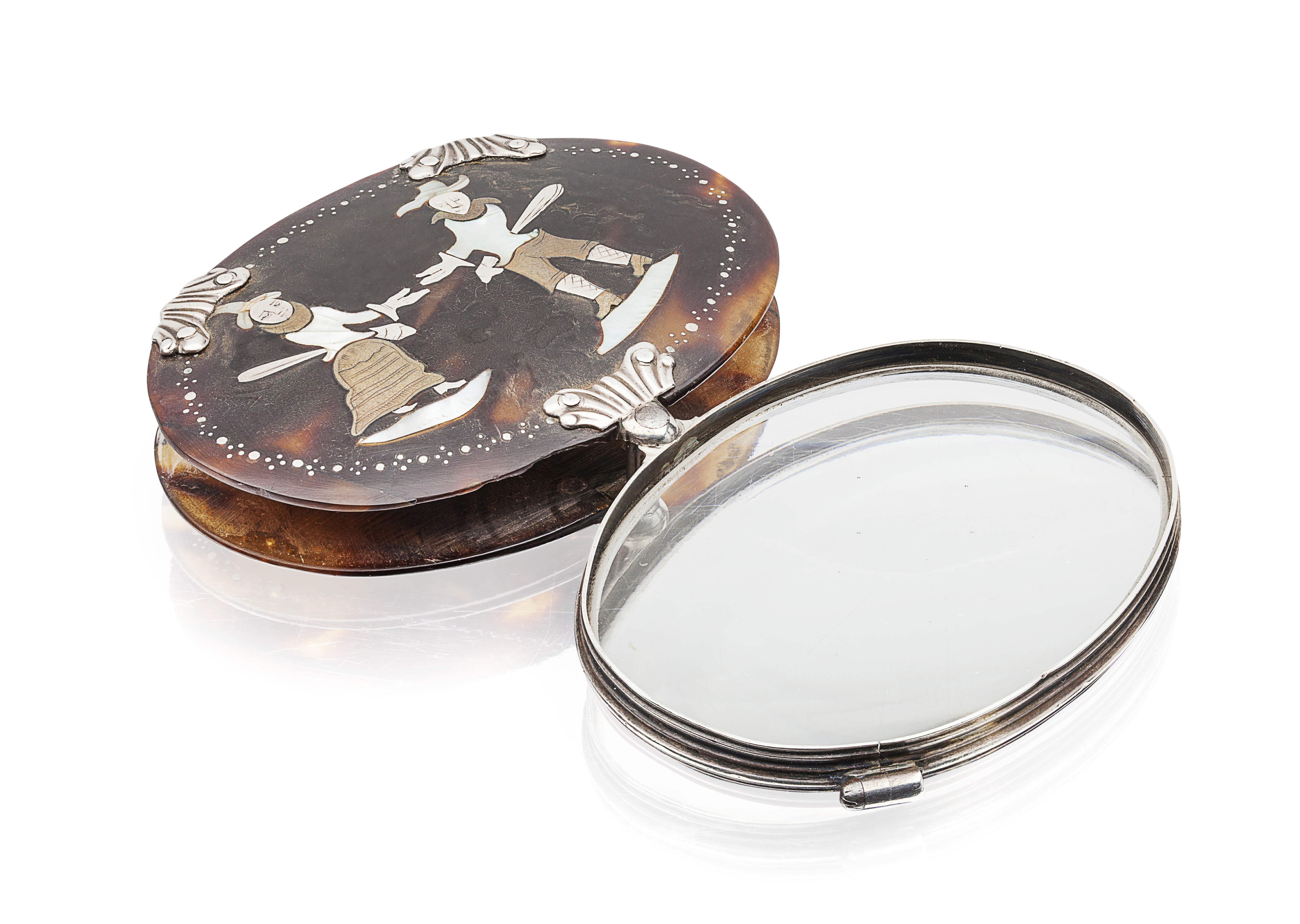 the oval covers enclosing a swivel silver framed glass, the covers with mother of pearl, silver and copper figural inlay, well shaped clasping also in silver
