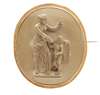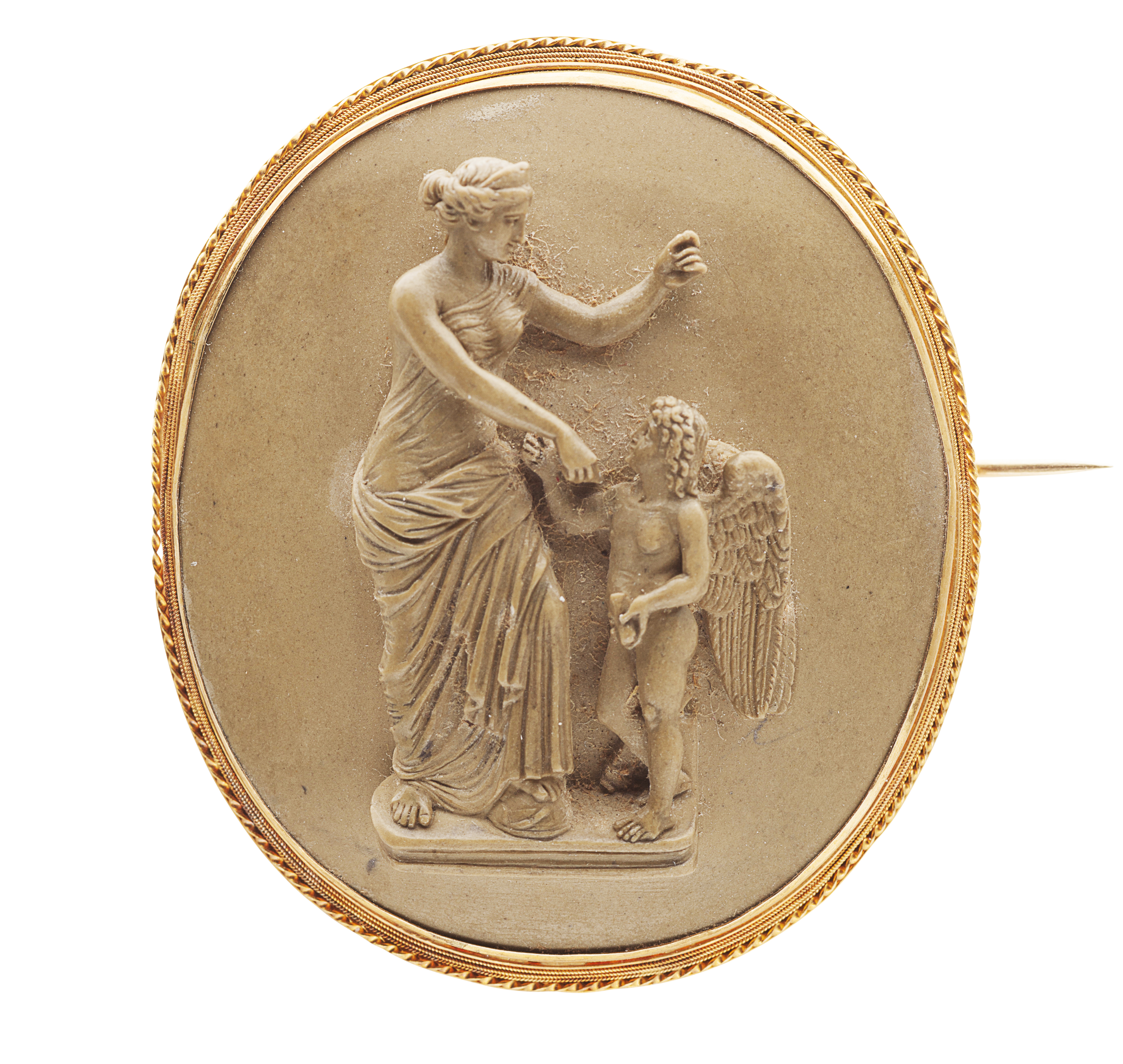 of oval outline, depicting classical figures in relief, the gold border with slight rope twist detail