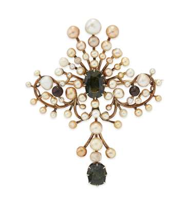 An unusual late 19th Century Scottish pearl and tourmaline set brooch