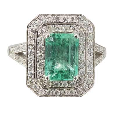 An emerald and diamond cluster ring