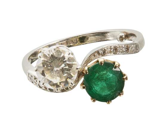 A diamond and emerald set twist ring