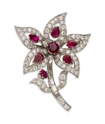 A Burmese ruby and diamond set floral brooch