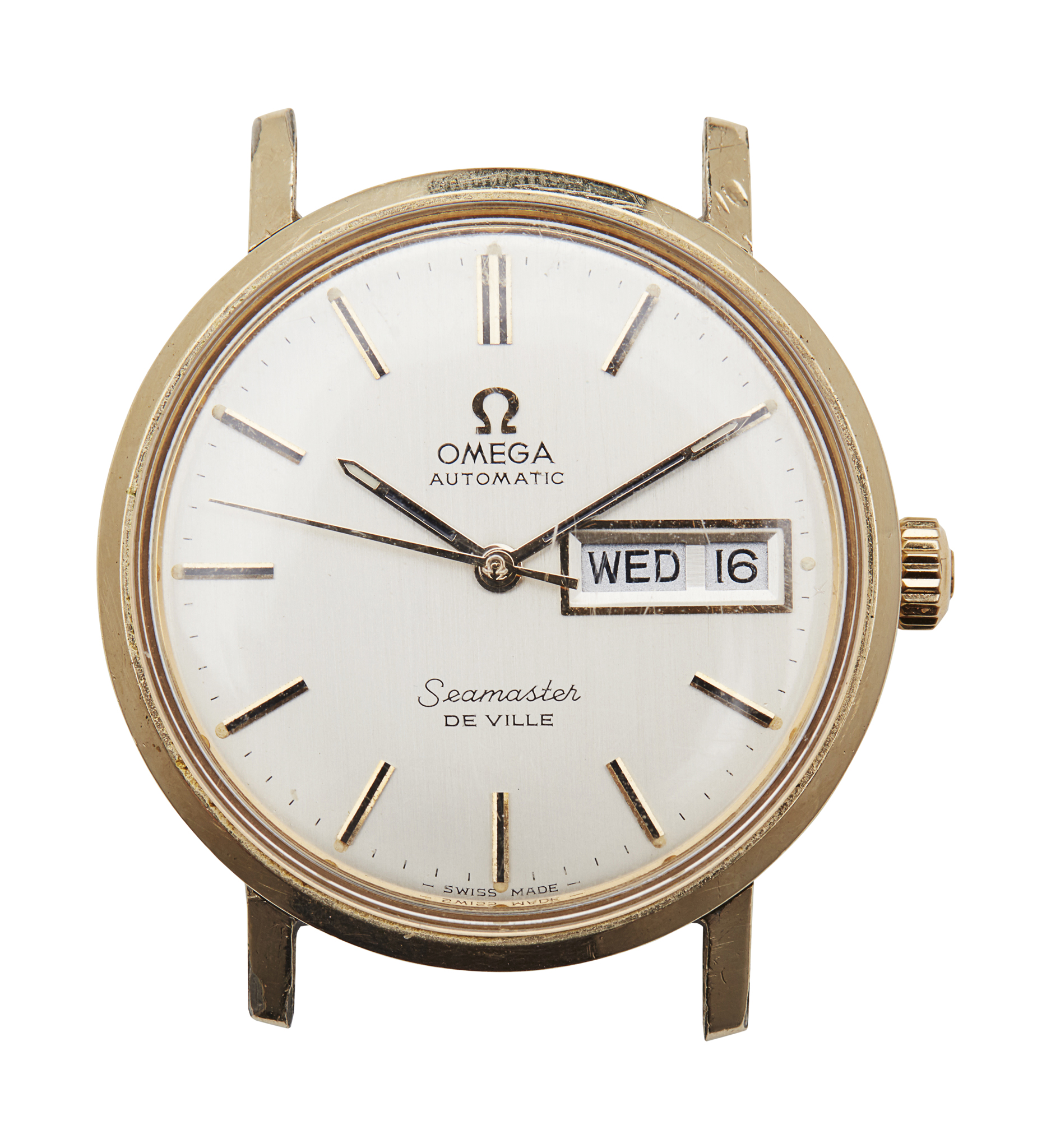 Seamaster, champagne dial, sweep second hand, day date, plain leather strap, gilt case