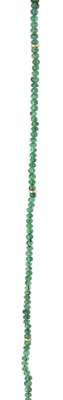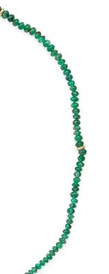 composed of a single strand of uniform emerald beads, small yellow metal spacers throughout, to a plain yellow metal barrel clasp stamped 750