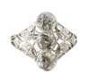 millegrain set with three old round cut diamonds, the shoulders of pierced scrolling design set with small round cut diamonds, to a plain unmarked white metal shank