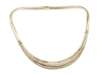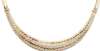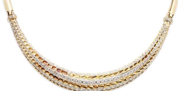 the central tapering panel set with three rows of graduated round cut diamonds on a textured yellow metal ground to an integral torc style necklace with a concealed clasp and safety clip, stamped 750