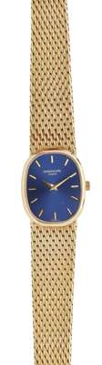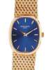Ellipse model, Cal No. 16 250, blue metallic dial, gold baton numerals, integral flexible gold bracelet, fold over clasp, movement no. 1'277'037, circa 1977