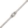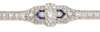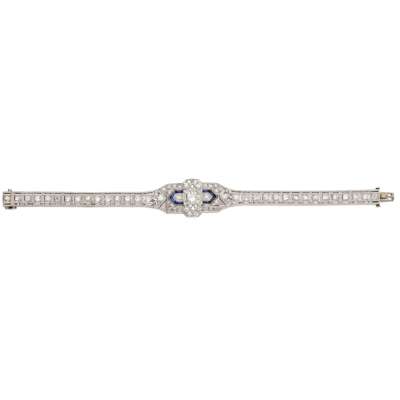 of articulated design, the central stepped panels each set with a round cut diamond and graduated smaller round cut diamonds and pierced detail, channel set sapphire accents, the remaining links each set with small round cut diamond, the whole with engraved detail to sides, concealed clasp and safety clip