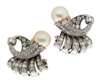 each of scrolling fanned design modelled in white metal and set throughout with graduated round and baguette cut diamonds, each set with a cultured pearl, with clip fittings