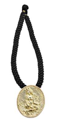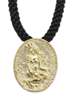 the oval yellow metal pendant depicting Virgo on a textured ground with beaded border and diamond set eyes, stamped 18K, to a thick woven cord necklace