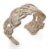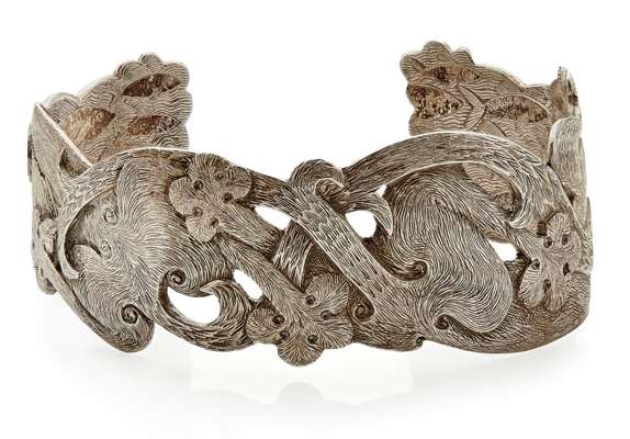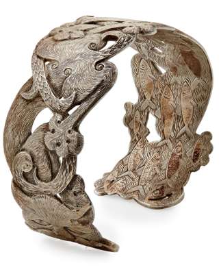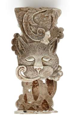 of pierced form depicting two stylized entwined cats with engraved textured detail, the inside with engraved detail of swimming fish