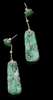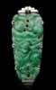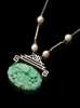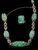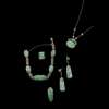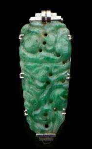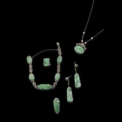 to include a white metal ring set with a rectangular carved jade panel, a pendant necklace set with an oval carved jade panel to a stylized white metal mount with pearl detail to the integral chain; a clip brooch with carved jade panel, a jade and paste set bracelet; a pair of jade and pearl set pendant earrings (5)