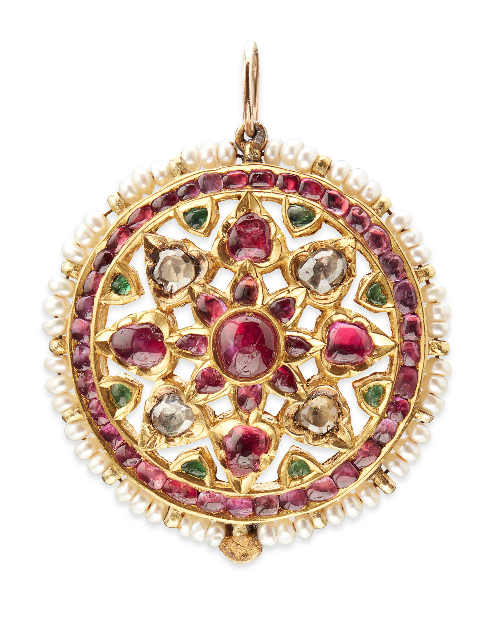 An Indian gold diamond, ruby, emerald, and pearl set pendant