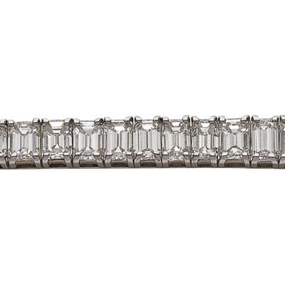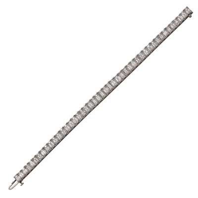claw set with a single row of forty five tapered baguette cut diamonds, set in white metal, indistinctly marked with French control marks for platinum, with concealed clasp and safety clips