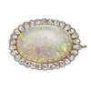 claw set with an oval opal in a single border of small millegrain set old round cut diamonds, modelled in unmarked yellow and white metal