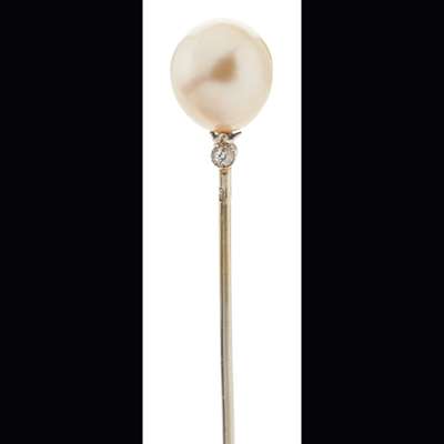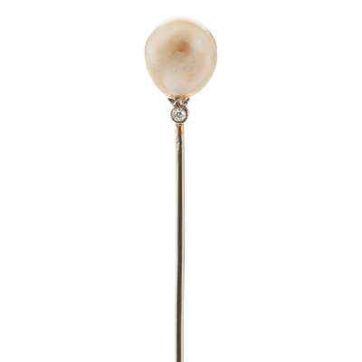 the terminal set with a flattened round pearl and two small millegrain set old cut diamonds, to a plain white metal pin; with accompanying report by The Gem & Pearl Laboratory dated 10.11.15, numbered 11976, stating the pearl is natural and of saltwater origin