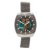 Accutron, brushed steel case, visible inner workings, grey bezel, white indicators and hands, orange sweep second hand, expanding bracelet, spare links, in original case with spare batteries and outer cardboard box