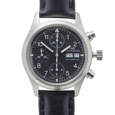 Der Fliegerchronograph, black dial and subsidiary dials, day and date aperture, brushed steel case, screw down winder and back, automatic movement, leather strap with buckle