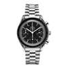 Speedmaster model, black tachymeter bezel, black dial, subsidiary seconds dial, normal stop start buttons and recorder dials, polished steel speedmaster bracelet