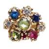 claw set with graduated round cut diamonds, rubies, sapphires and green tourmalines, set in a textured yellow metal ground, plain shank stamped 750