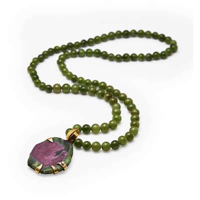 the polished zoisite panel with a large hexagonal ruby crystal, in a stylised claw setting with textured detail, set with a single small round cut diamond, similar stylised bale, stamped to reverse GRIMA 750, to a single strand of slightly graduated jade beads