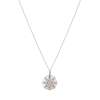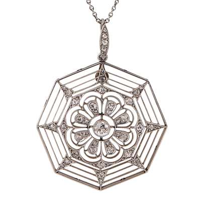 of octagonal pierced design with floral detail, set with small eight and old round cut diamonds, modelled in unmarked white metal, to a plain link chain with box clasp