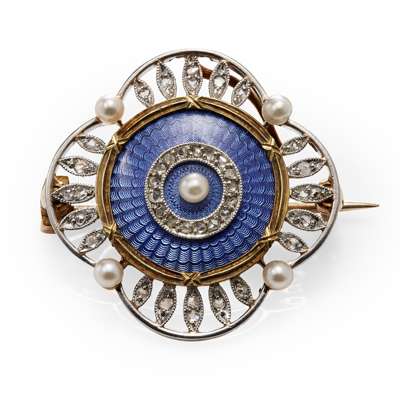 of lobed circular outline, the central guilloche enamel panel with onset pearl and rose cut diamond detail, the pieced border also set with rose cut diamond lozenges and four pearls, in a fitted case by Edward & Sons, Glasgow