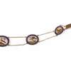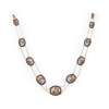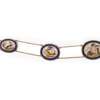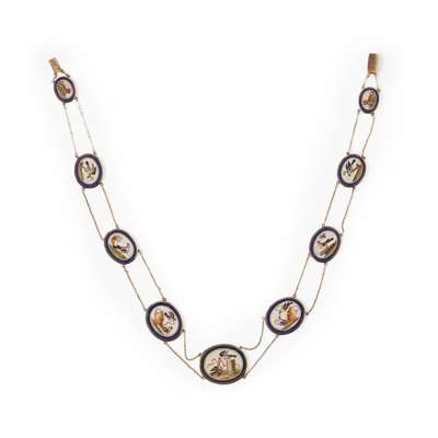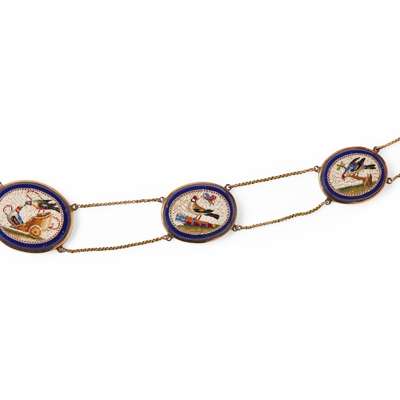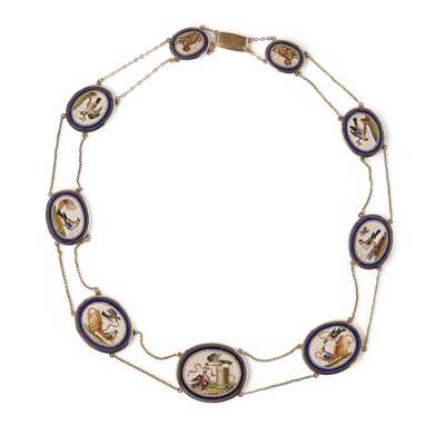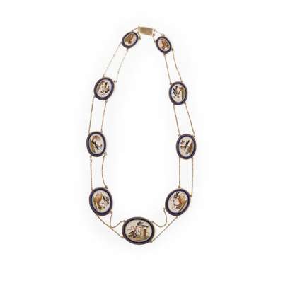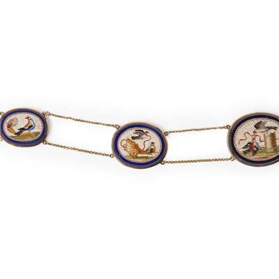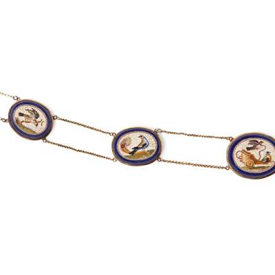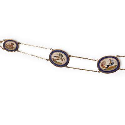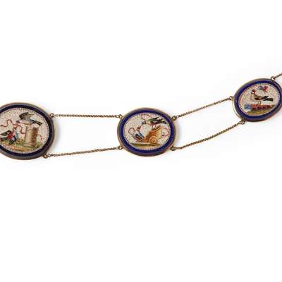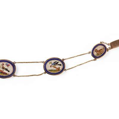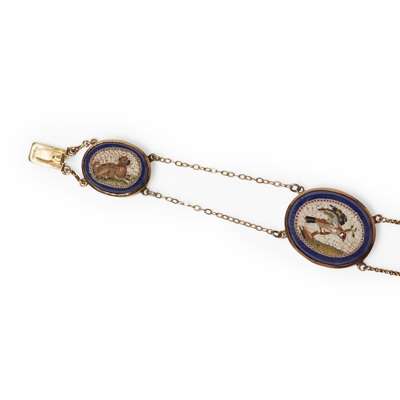 composed of nine graduated micromosaic panels depicting various birds and dogs in classical settings, each joined by double yellow metal chains, with a box link clasp