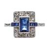 millegrain set with a rectangular cut sapphire, in a border of eight cut diamonds, the shoulders each set with two square cut sapphires, to a plain white metal shank stamped PLAT