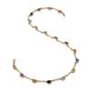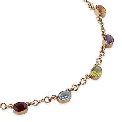 collet set with various oval cut peridots, amethysts, citrines, garnets and aquamarines, the links with twisted detail, set in unmarked yellow metal
