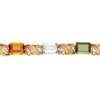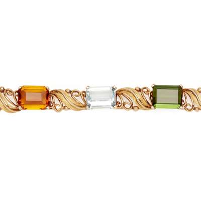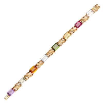 claw set with various trap cut amethysts, citrines, beryls and tourmalines, between pierced scrolling yellow metal links, with a concealed clasp and safety chain, stamped 18K