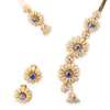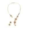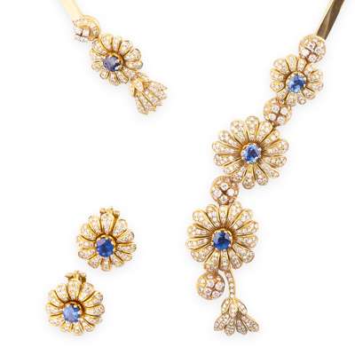 the necklace of stylised collar form, the asymmetric terminals of floral design set throughout with small round cut diamonds and oval cut sapphires, the earrings of matching floral design, with clip fittings stamped 750 (2)