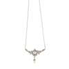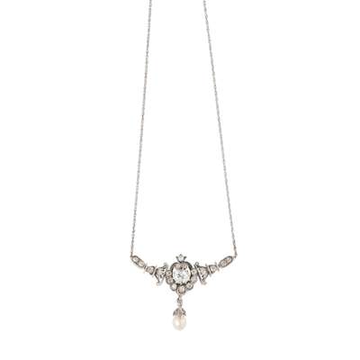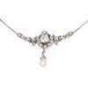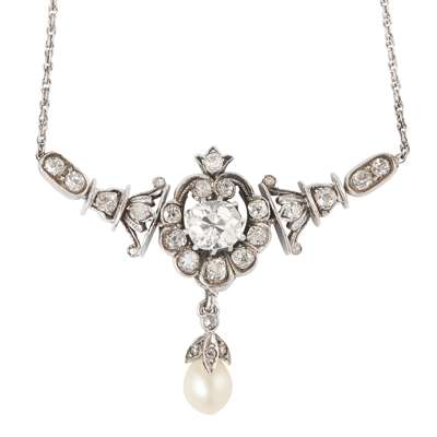 claw set with a large old mine cut diamond, within a scrolling petal shaped surround flanked by foliate scroll shaped links, set with graduated old mine cut diamonds, with detachable rose cut diamond and pearl (untested) set drop, to fancy ropetwist link chain, clasp stamped 9K, with tooled leather fitted case for 'Hamilton & Inches ... Edinburgh'