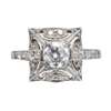 claw set with an old round cut diamond in a pierced square surround set with small round cut diamonds, the shoulders similarly set, modelled in white metal, stamped BIRKS PLAT