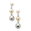 each set with a cream and golden cultured pearl, between collet set diamonds, terminating in a grey drop shaped pearl, mounted in unmarked white metal with post and butterfly fittings