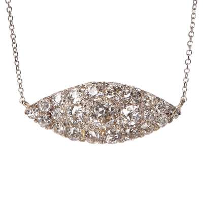 the navette pendant pavé set with old round and eight cut diamonds, to an integral chain stamped 750