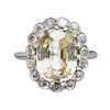 claw set with an oval cut pale yellow sapphire in a single border of small round cut diamonds, to a plain white metal shank stamped W18CT
