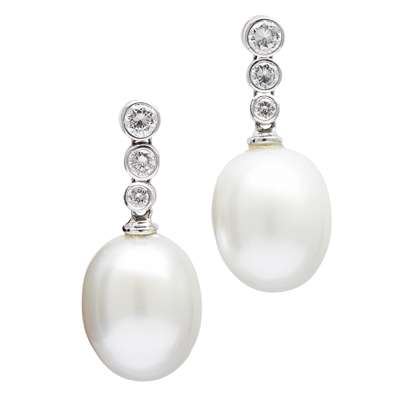 each collet set with three graduated round brilliant cut diamonds, terminating in an oval pearl drop, to post and butterfly fittings