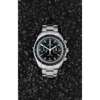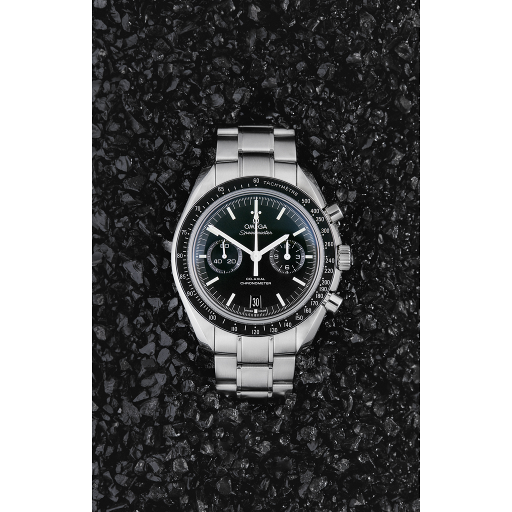Speedmaster Co Axial Chronometer (Moonwatch), black tachymeter bezel, black main and subsidiary dials, baton indicators, polished steel bracelet, fold over clasp, sapphire crystal to front and rear, visible movement